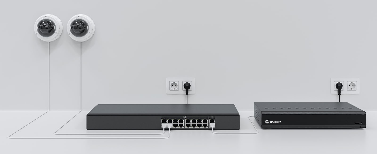 Med en PoE-switch kan du smidigt integrera kamerasystemet i ett befintligt nätverk. Switchens uppgift är att ansluta kamerorna till nätverket och samtidigt förse dem med ström. När även inspelaren är uppkopplad mot samma nätverk upprättas automatiskt en anslutning till kamerorna.
