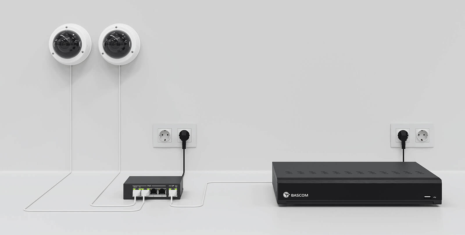 Med en PoE-switch kan du smidigt integrera kamerasystemet i ett befintligt nätverk. Switchens uppgift är att ansluta kamerorna till nätverket och samtidigt förse dem med ström. När även inspelaren är uppkopplad mot samma nätverk upprättas automatiskt en anslutning till kamerorna.