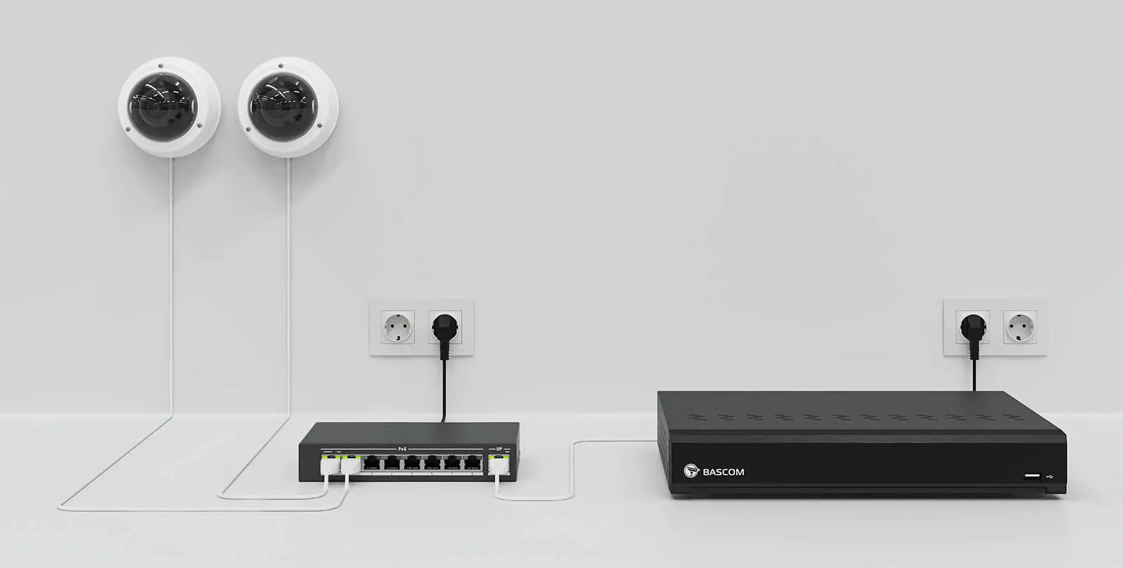 Inspelaren är kompatibel med både trådlösa och kabelanslutna Bascom-kameror, oavsett modell eller serie – eller en kombination av båda. Det ger dig full frihet att bygga ett system som passar dina behov.