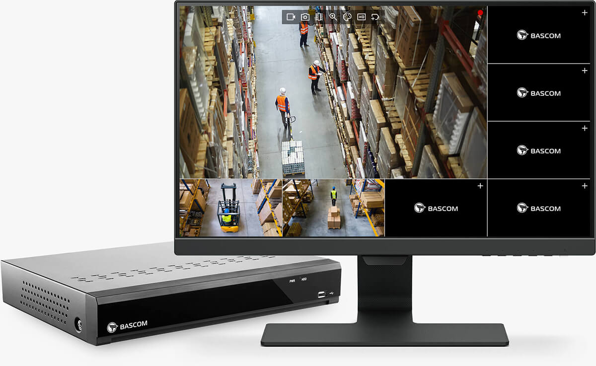 Denna monitor är vårt rekommenderade val för användning med ett Bascom-kamerasystem. Du ansluter den enkelt till inspelaren med den medföljande HDMI-kabeln. Därefter kan du se livevideo från kamerorna – helt utan internetanslutning. Systemet styrs med musen som följer med inspelaren.