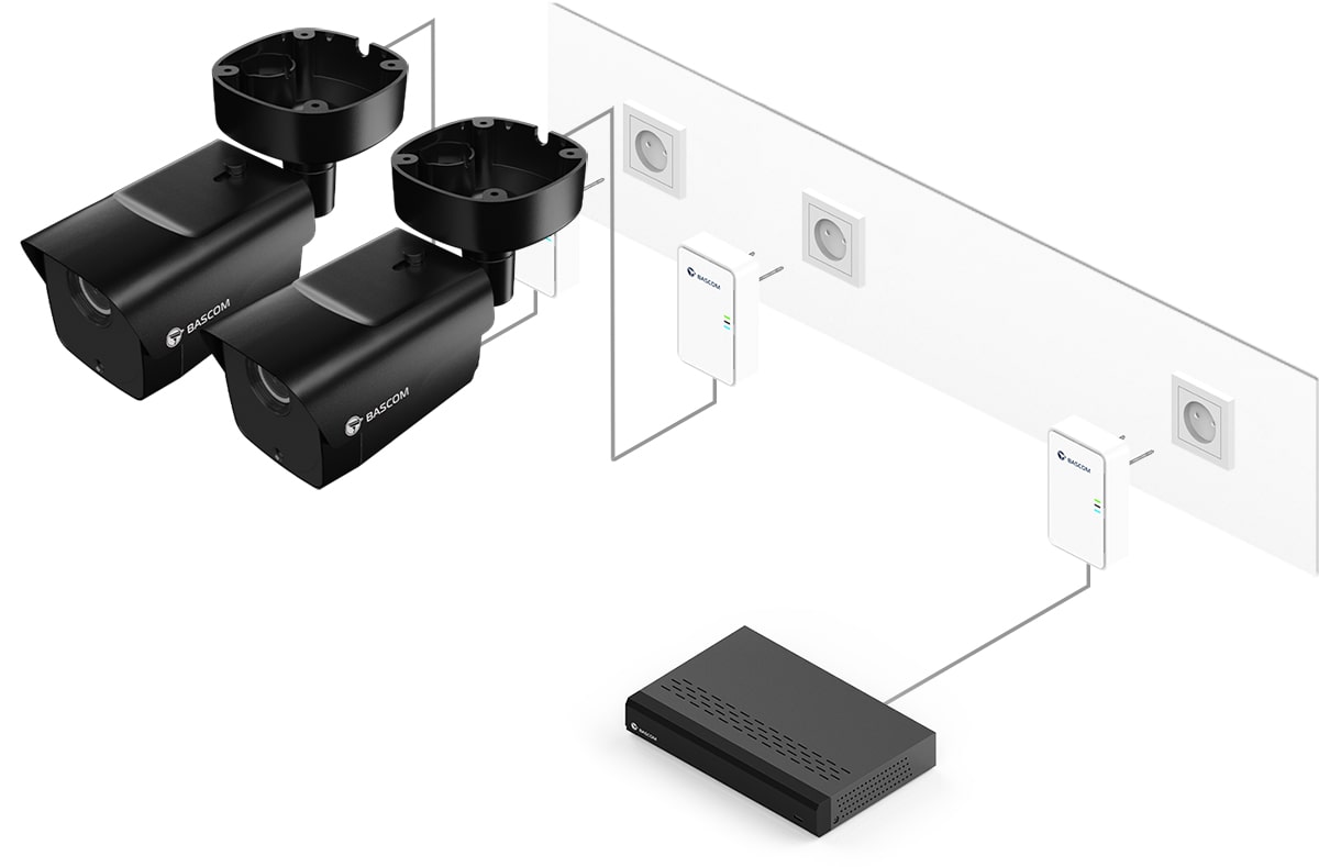 Detta kamerasystem är utrustat med Bascom® POWER, vår banbrytande teknik för att överföra videoströmmar via elnätet. Du pluggar enkelt in kamerorna i vanliga eluttag, och de ansluter automatiskt till inspelaren via befintliga elkablar. Du får därmed samma tillförlitlighet som en kabelanslutning, utan att dra kablar själv.