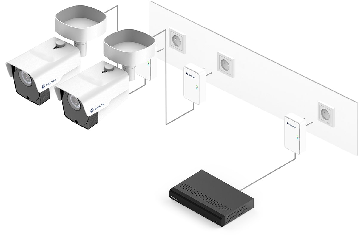 Detta kamerasystem är utrustat med Bascom® POWER, vår banbrytande teknik för att överföra videoströmmar via elnätet. Du pluggar enkelt in kamerorna i vanliga eluttag, och de ansluter automatiskt till inspelaren via befintliga elkablar. Du får därmed samma tillförlitlighet som en kabelanslutning, utan att dra kablar själv.