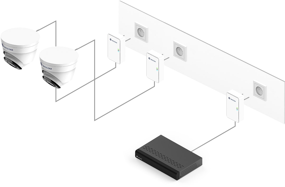 Detta kamerasystem är utrustat med Bascom® POWER, vår banbrytande teknik för att överföra videoströmmar via elnätet. Du pluggar enkelt in kamerorna i vanliga eluttag, och de ansluter automatiskt till inspelaren via befintliga elkablar. Du får därmed samma tillförlitlighet som en kabelanslutning, utan att dra kablar själv.